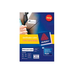 Avery 8UP Fabric Laser Name Badge Labels 15 Sheets These labels are textile-friendly leaving no residue or damage behind. Each label measures 86.5 x 55.5 mm. These labels are compatible for use with laser printers. You can create your own design or search the software code L418 on the Avery website for pre-designed templates. Jam free technology ensures that they print clearly and smudge free.